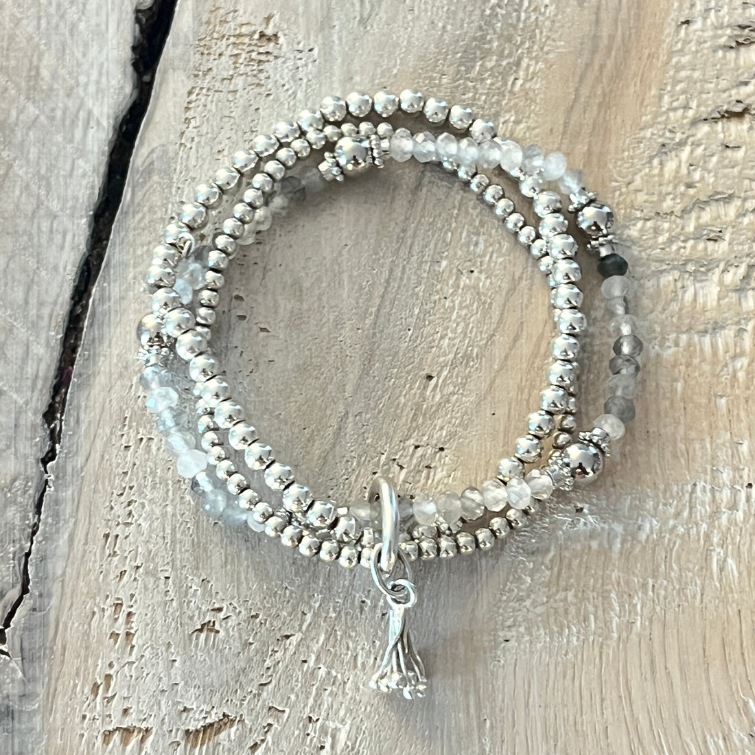 Elastarmband Labradorit 5mm mit Silberteilen, ein 3mm und ein 4mm 925 Silberkugelarmband, der Verschluss und das wunderschöne Silberteil sind 925 Sterlingsilber