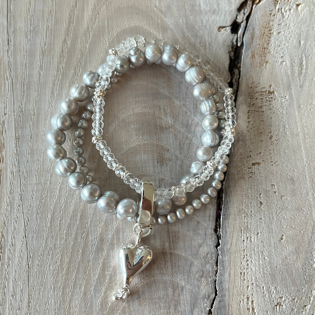 Elastarmband Süsswasserperlen lightgrey 8mm und 4mm mit einem Bergkristall-Armband, der Verschluss und Herzanhänger sind 925 Sterlingsilber