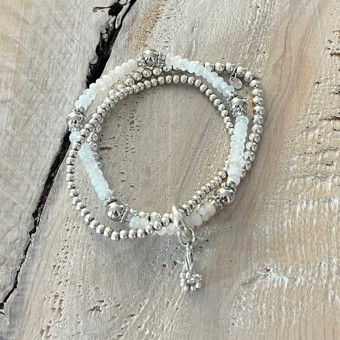 Elastarmband Regenbogen Mondstein 5mm mit Silberteilen, ein 3mm und ein 4mm 925 Silberkugelarmband, der Verschluss und das wunderschöne Silberteil sind 925 Sterlingsilber