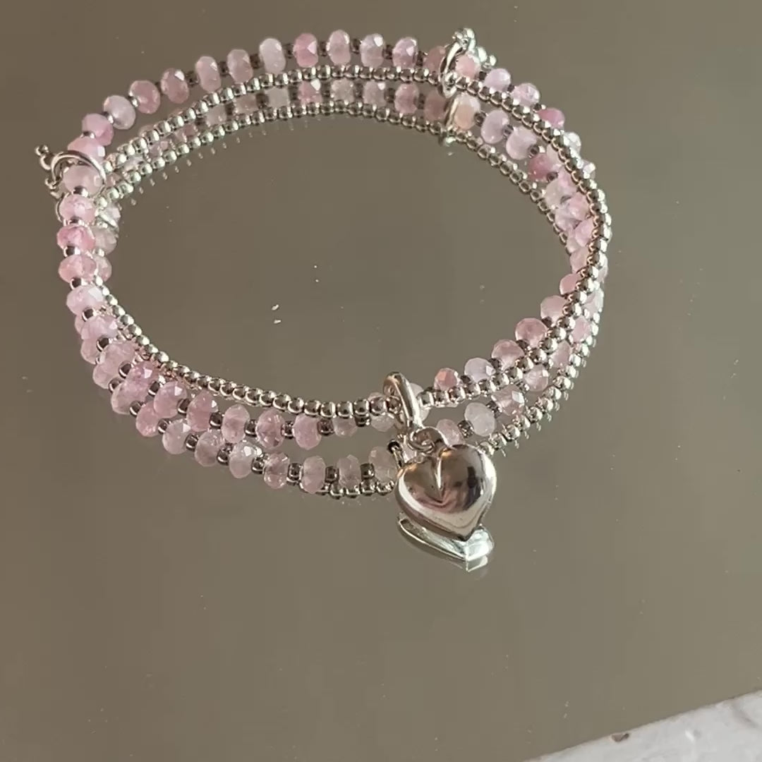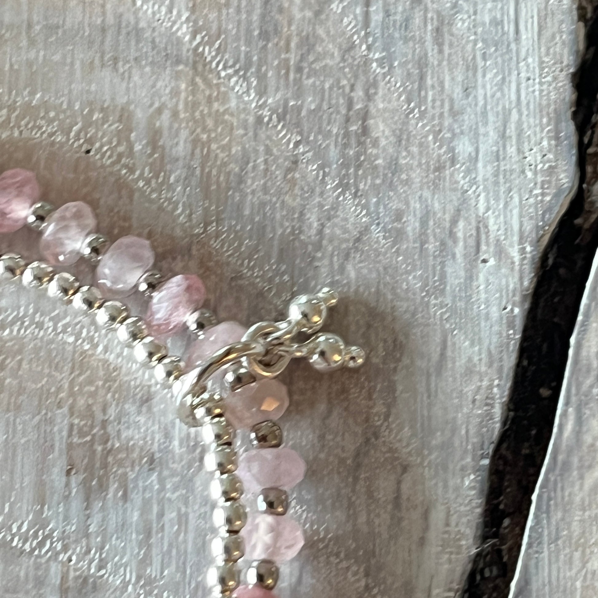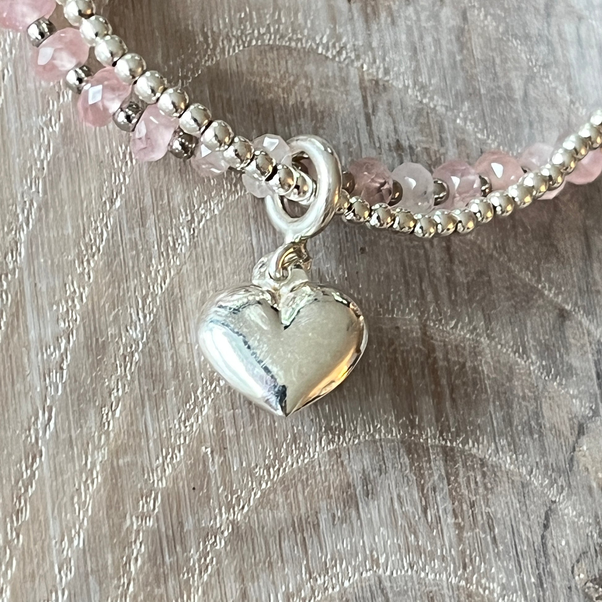 Dieses einzigartige Armband ist eine wunderschöne Kombination aus einem 3mm Rosenquarz-Armband mit Silberkügelchen und einem 2mm 925 Sterlingsilberkugel-Armband. Ein kleiner 925 Silber Herzanhänger und 2 weitere Verbindungsteilchen verleihen dem Armband eine verspielte Note. Eine perfekte Ergänzung für jedes Outfit.