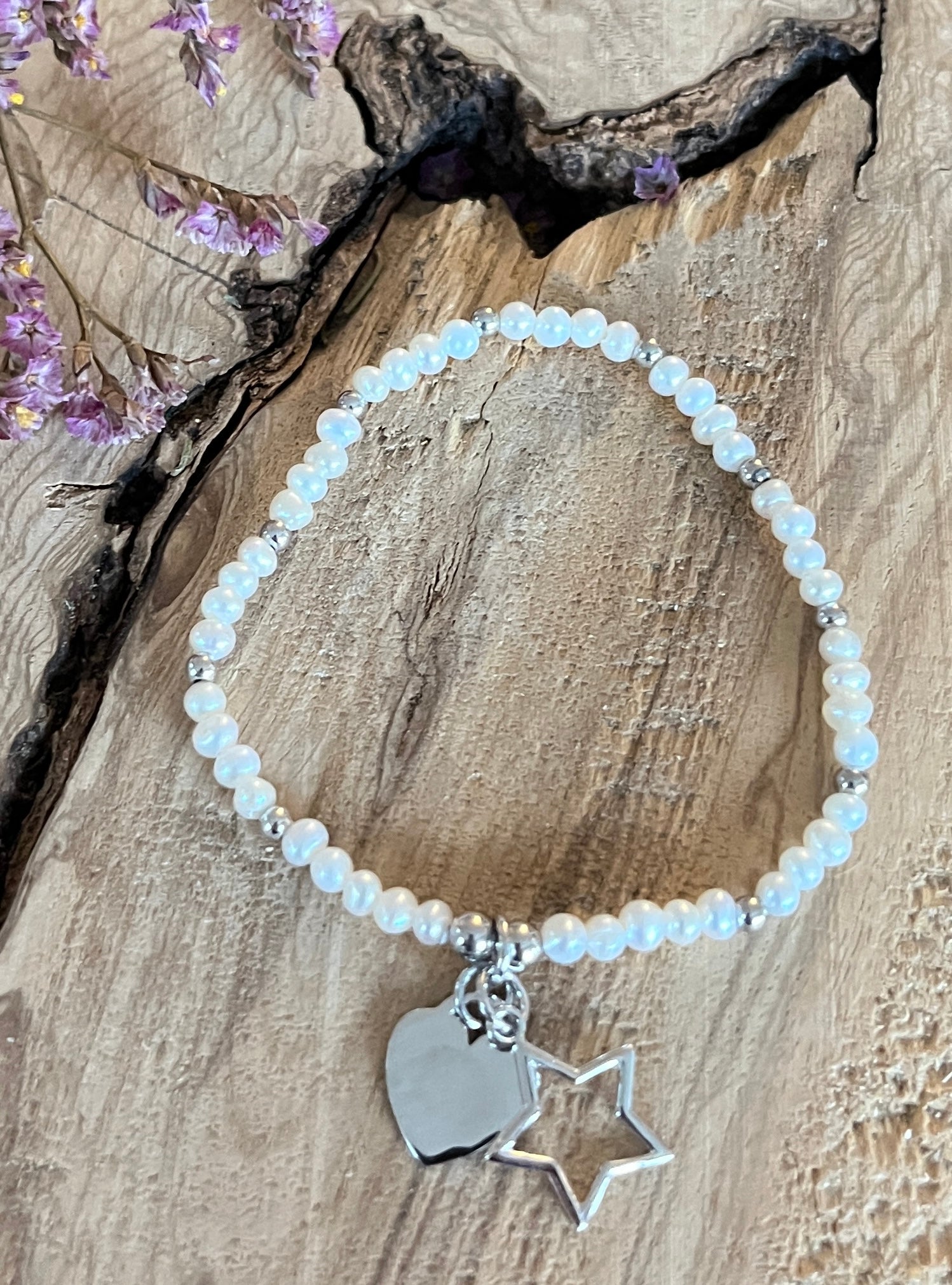 Elastarmband 925 Sterlingsilber mit Süsswasserperlen 4mm. Zwei Anhänger Herz und Stern 925 Sterlingsilber