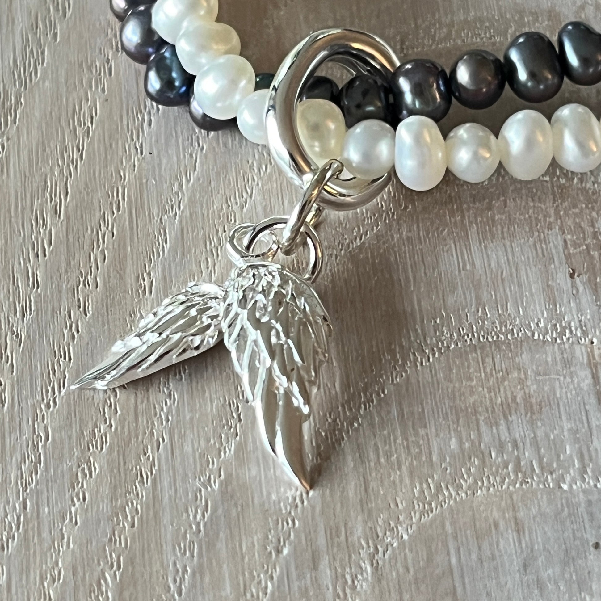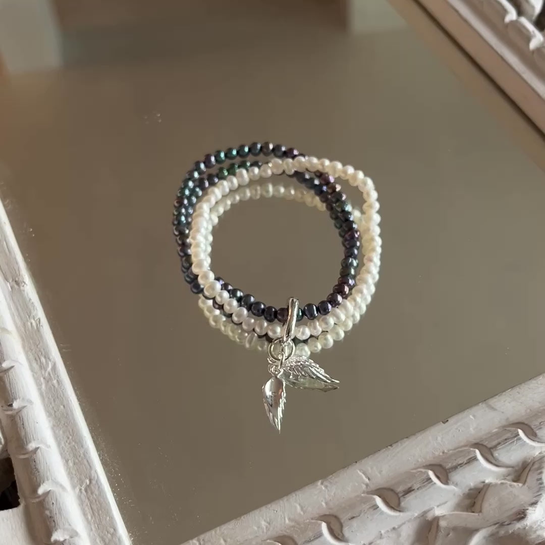 Ultra-flexibles Armband mit dunkelgrauen und weiss 5mm Süsswasserperlen. Der Verschluss und die Federn bestehen aus hochwertigem 925 Sterlingsilber. Ca.18cm Umfang. Für einen verspielten Look mit einer Prise Eleganz.