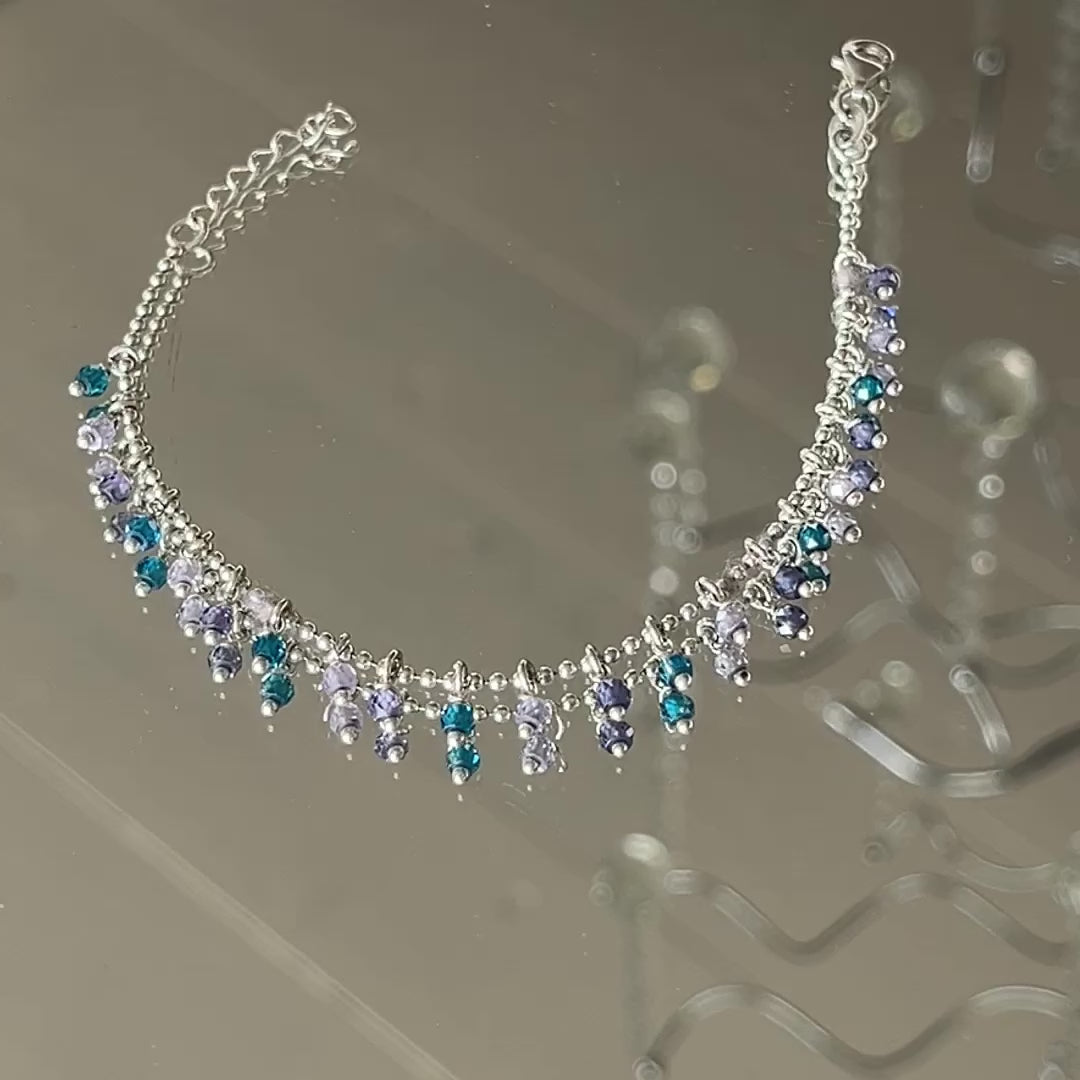 Diese Armkette mit Kügelchen in verschiedenen Blautönen ist ein echter Hingucker! Die vielen Anhänger mit gefärbten Zirkonia verleihen der Kette einen verspielten und einzigartigen Look. Der Umfang ist verstellbar von 17-19cm, damit passt sie perfekt zu jedem Handgelenk. Zeige deine Individualität mit dieser trendigen Armkette! AK 47-0015-8-17/19