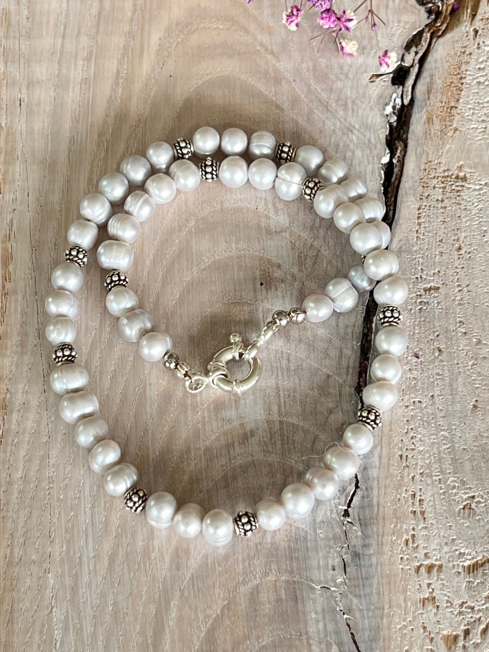 Einzelanfertigung Süsswasserperlen-Kette weiss mit 925 Sterlingsilberteilchen 45,5cm