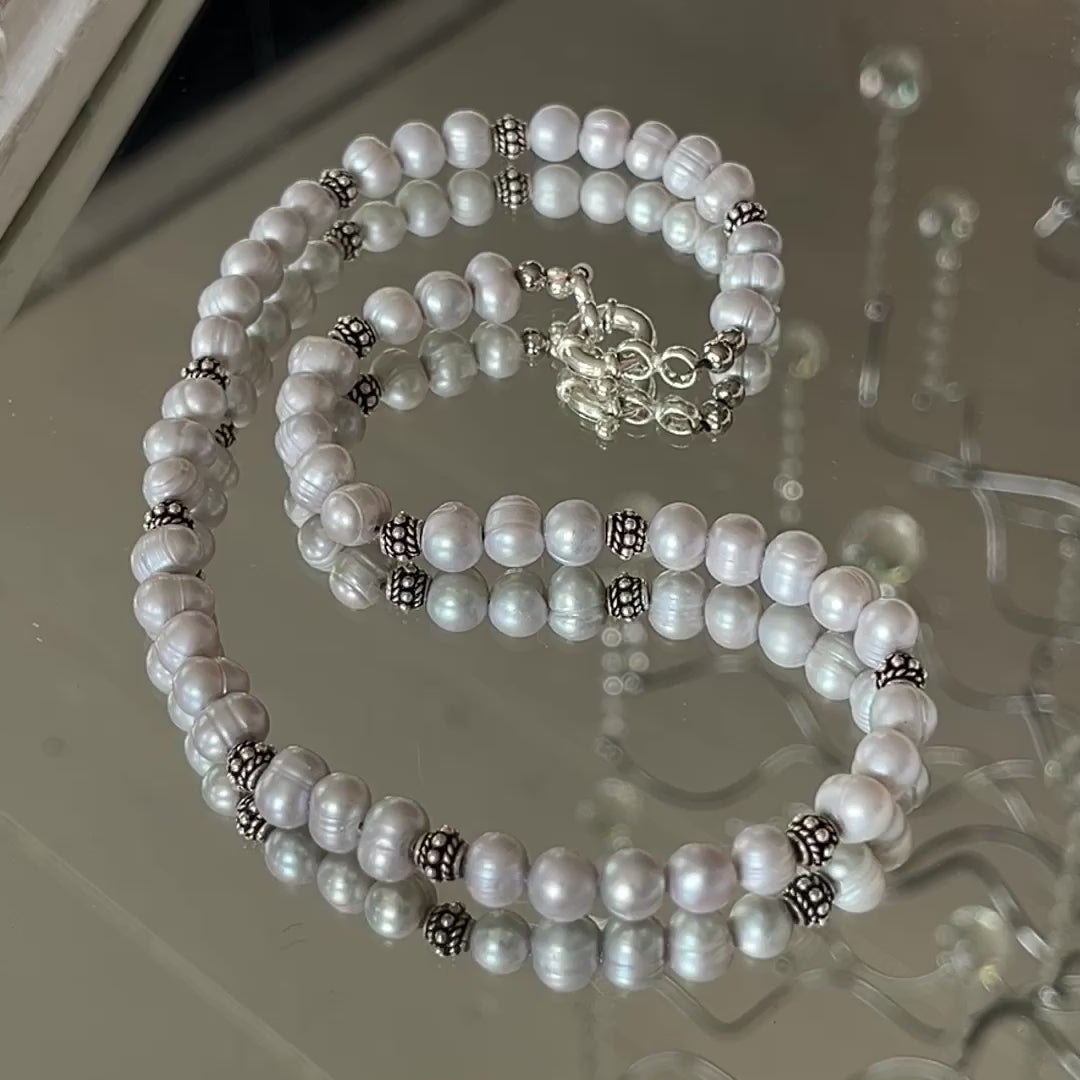 Erhalte einzigartige Eleganz mit dieser handgefertigten Süsswasserperlen-Kette. Die weißen Perlen werden von echten 925 Sterlingsilberteilchen geziert und verleihen der 45,5cm Kette einen besonderen Charme. Ein echter Blickfang!