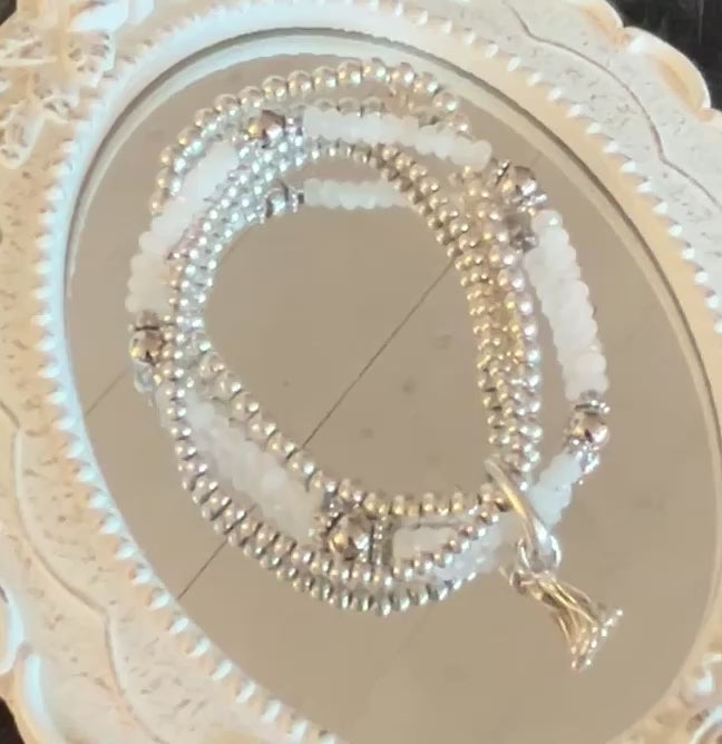 "Das Elastarmband Regenbogen Mondstein 5mm ist ein wahres Unikat mit seinen Silberteilen, 3mm und 4mm 925 Silberkugelarmbändern, sowie einem 925 Sterlingsilber-Verschluss. Ultra-flexibel und 18cm Umfang, ist es ein mega Hingucker. Mit diesem wunderschönen Schmuckstück ziehst du garantiert alle Blicke auf dich!"