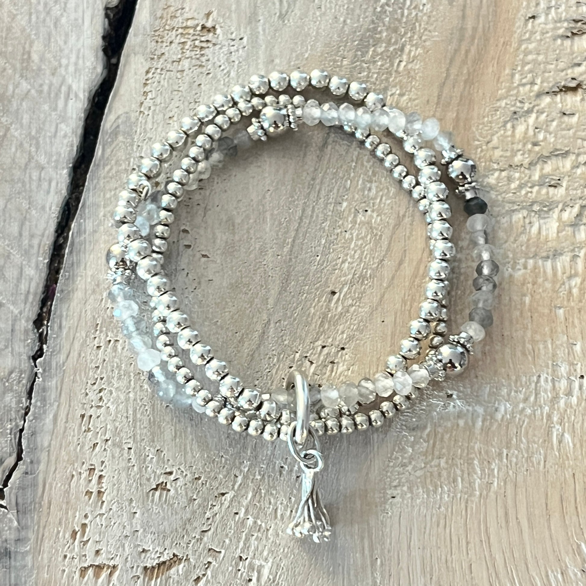 Elastarmband Silberquarz 5mm mit Silberteilen, ein 3mm und ein 4mm 925 Silberkugelarmband, der Verschluss und das wunderschöne Silberteil sind 925 Sterlingsilber