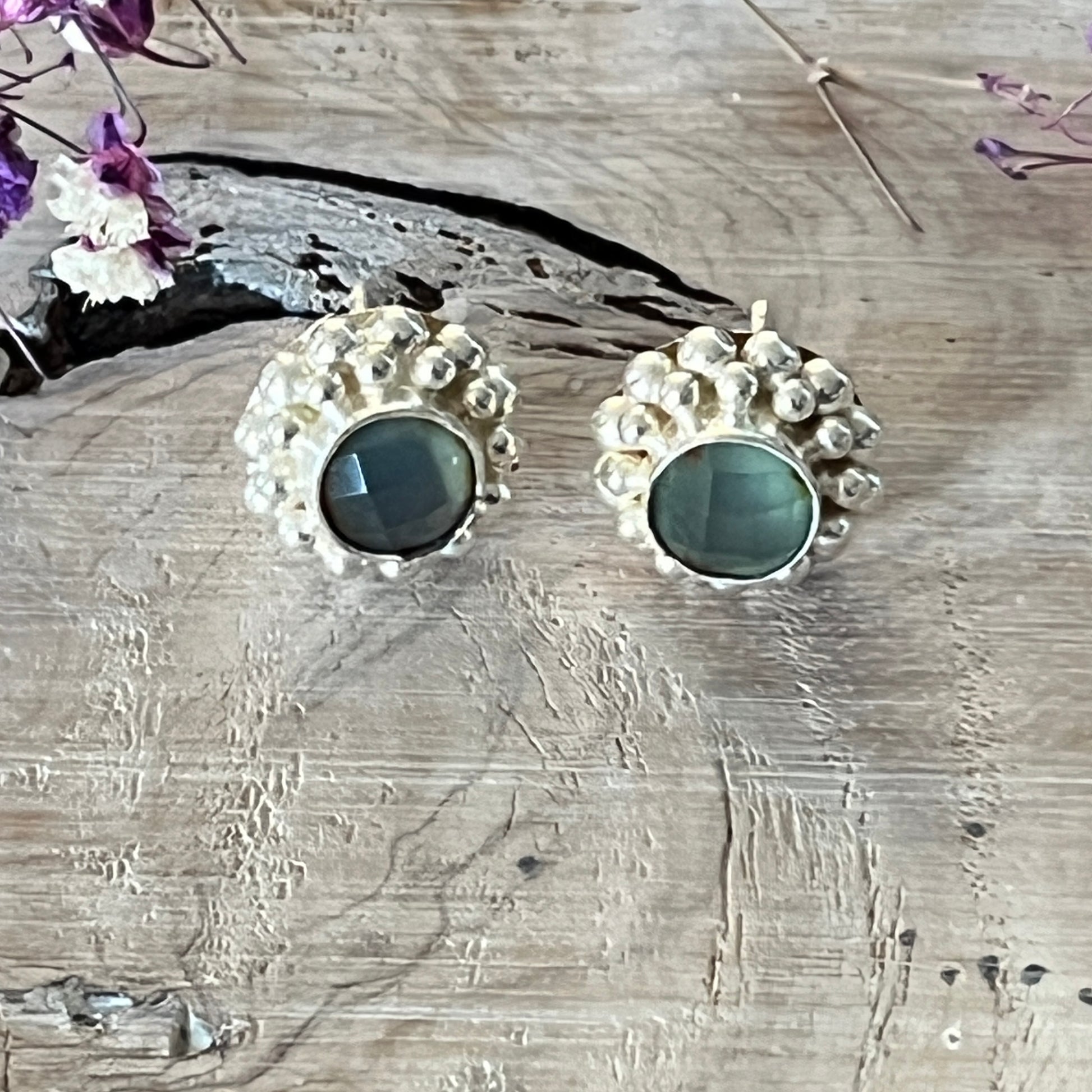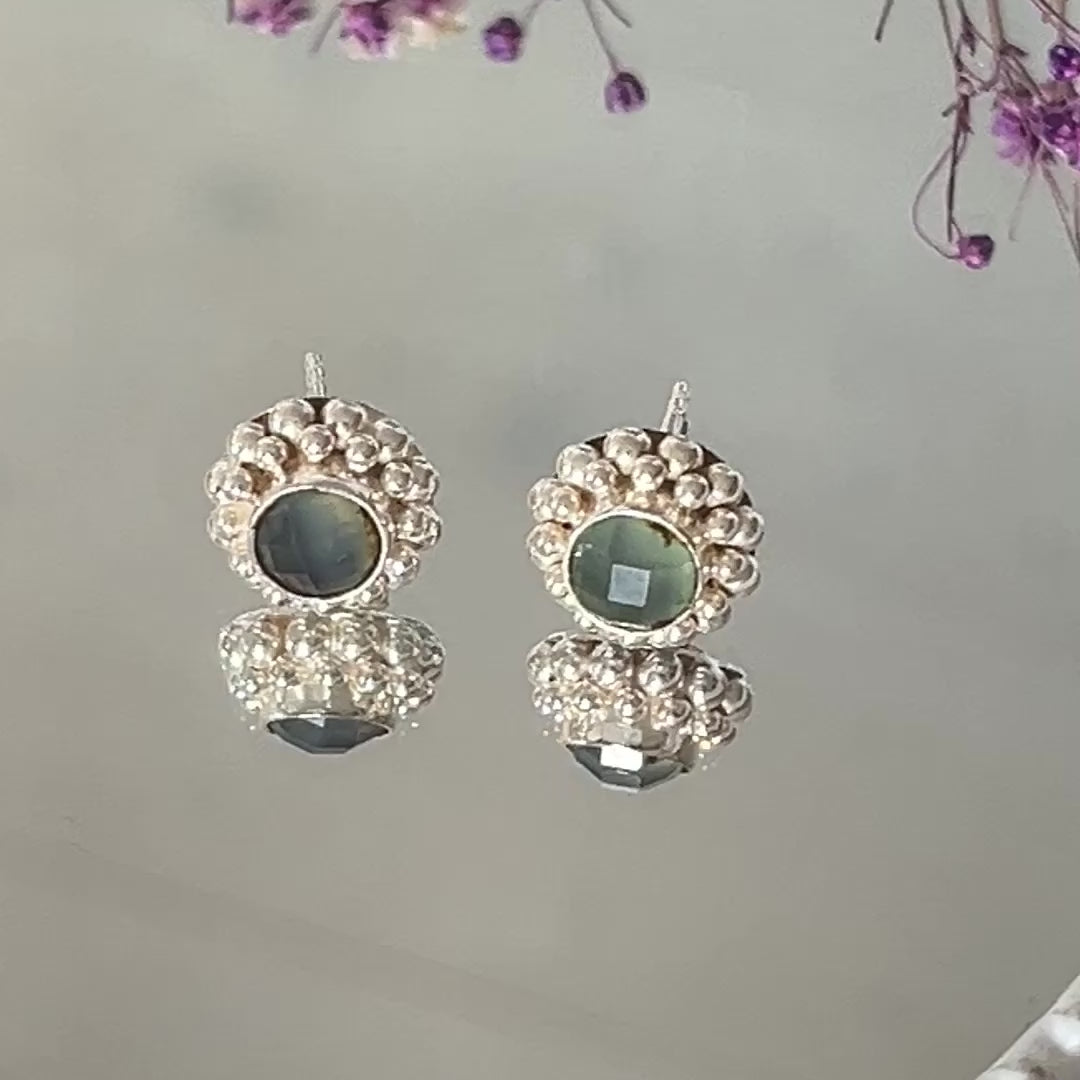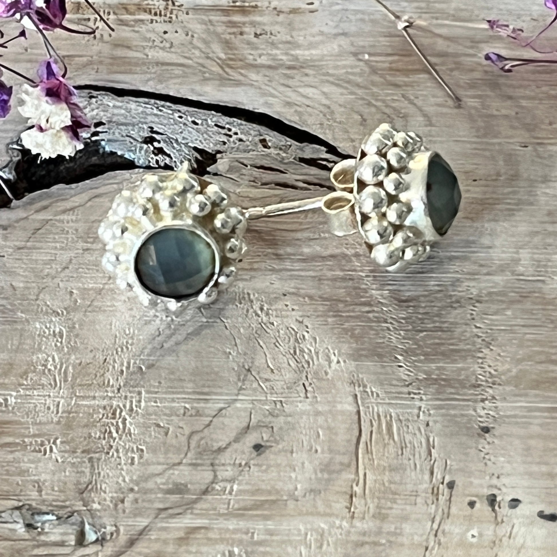 Diese Ohrstecker aus 925 Sterlingsilber lassen sich mit einem 10mm Labradorit oder einem Stein deiner Wahl personalisieren. Einzigartiger Schmuck für jeden Tag mit individueller Note.OH115