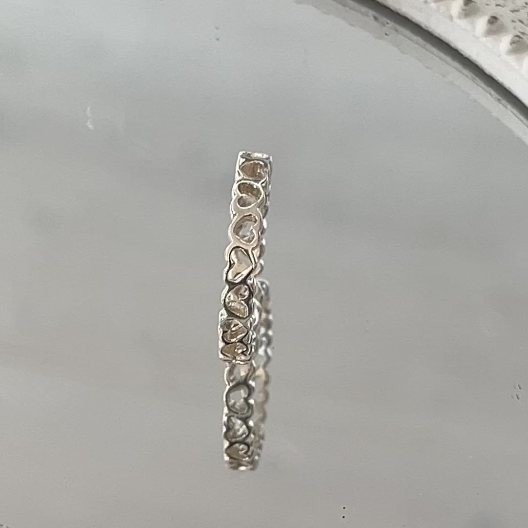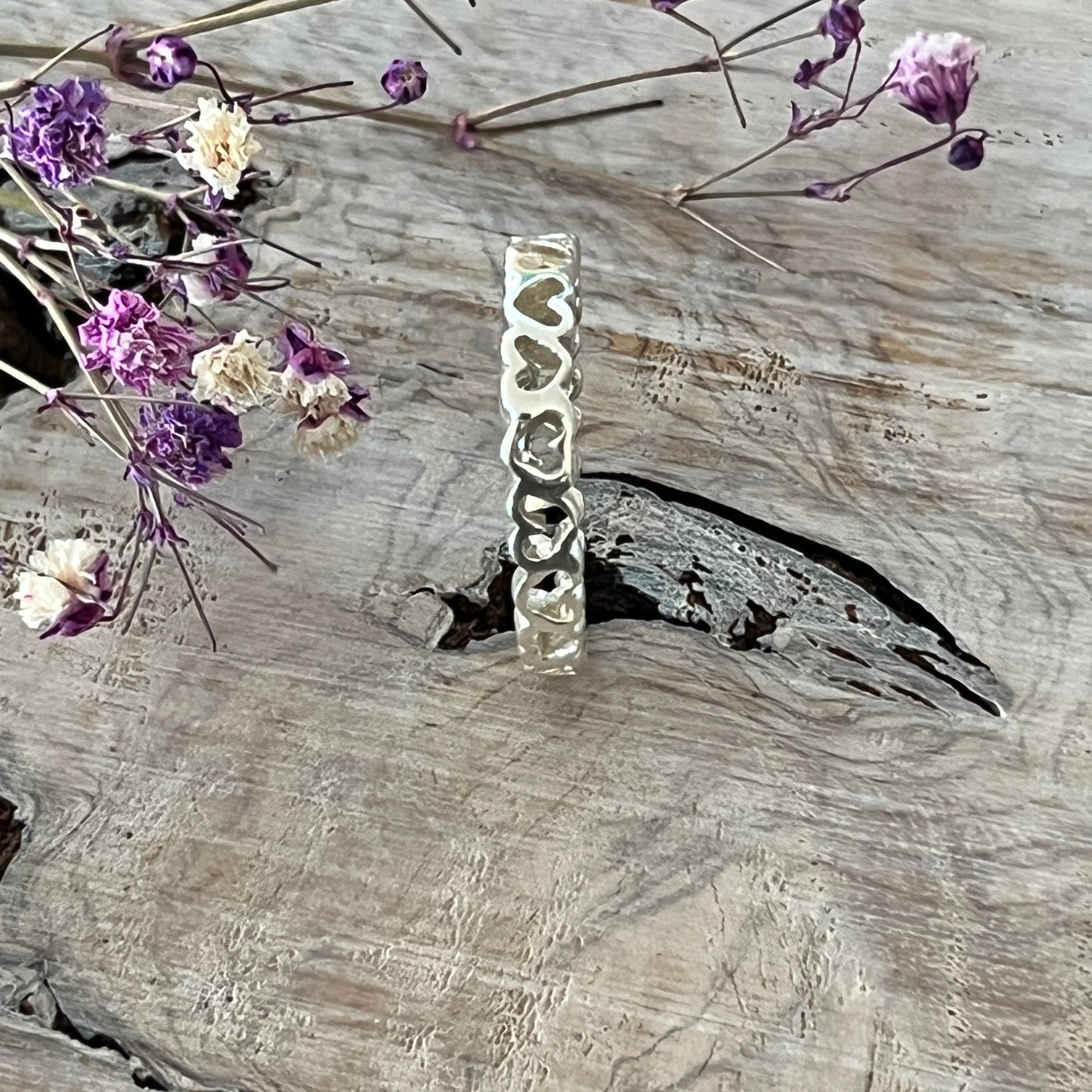 Dieser feine Ring aus 925er Sterlingsilber ist ein echter Hingucker! Die vielen Herzen, die aneinandergereiht sind, symbolisieren die unendliche Liebe. Mit einer Breite von nur 3,5mm ist er perfekt für den Alltag geeignet und lässt sich wunderbar mit anderen Schmuckstücken kombinieren. Ein echtes Must-Have (oder besser gesagt ein Herz-Have) für Schmuckliebhaber! R74