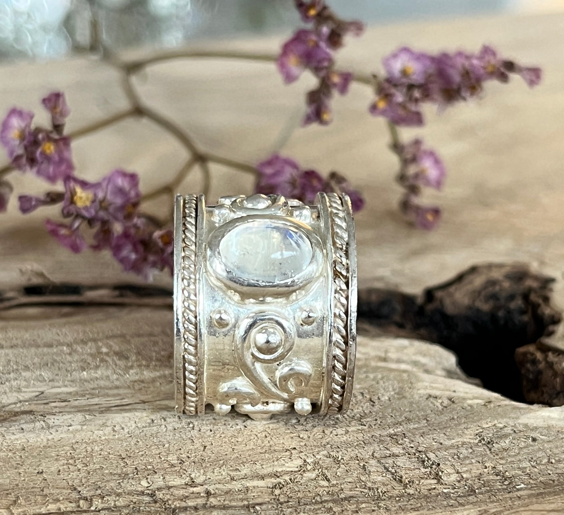 Ein wunderschöner Ring aus 925er Sterlingsilber mit einem funkelnden Regenbogenmondstein. Die Ringbreite beträgt 17mm und die verzierte Oberfläche verleiht dem Ring einen edlen Touch. Gönnen Sie sich diesen hübschen Ring für besondere Anlässe oder tragen Sie ihn täglich für einen Hauch von Luxus. (R49)