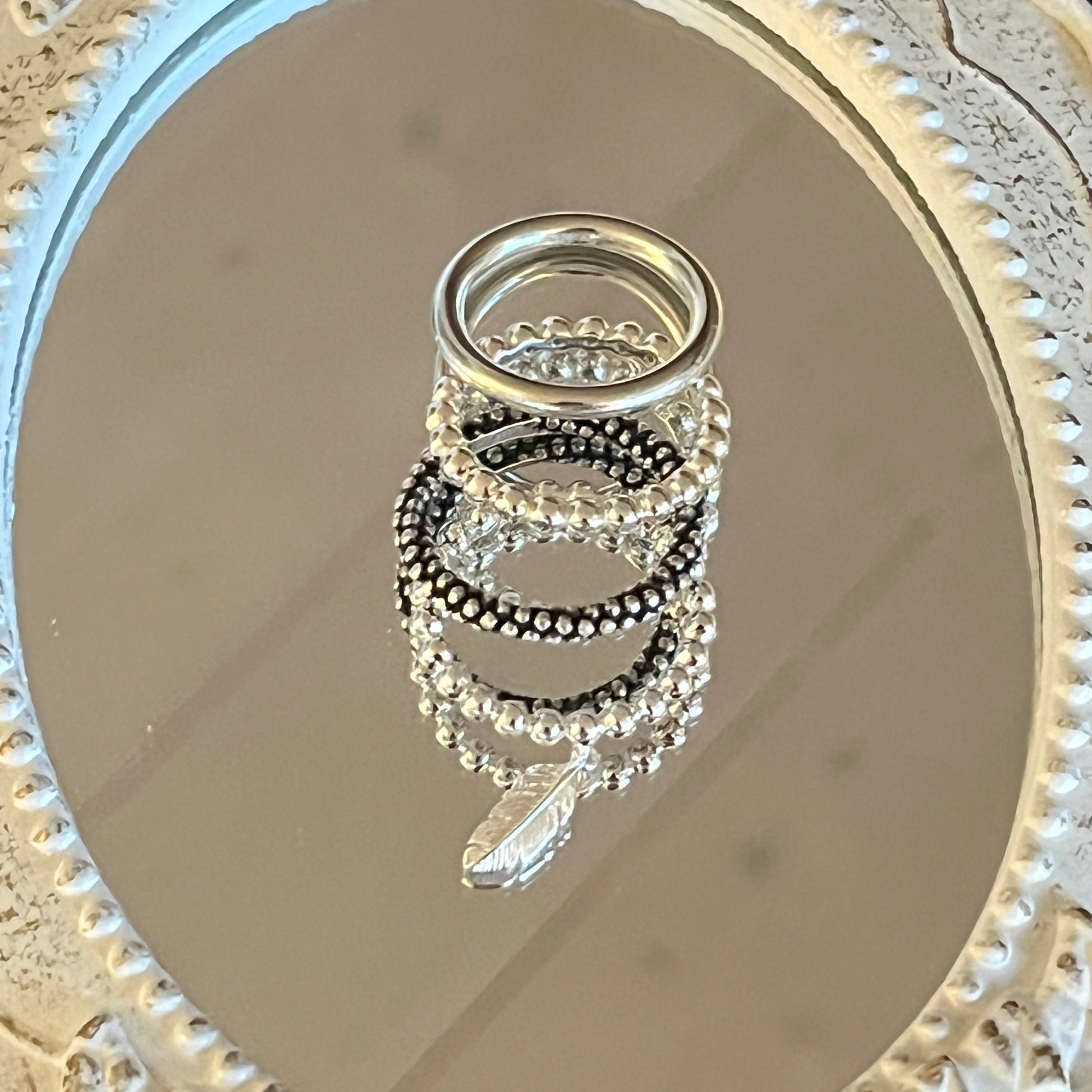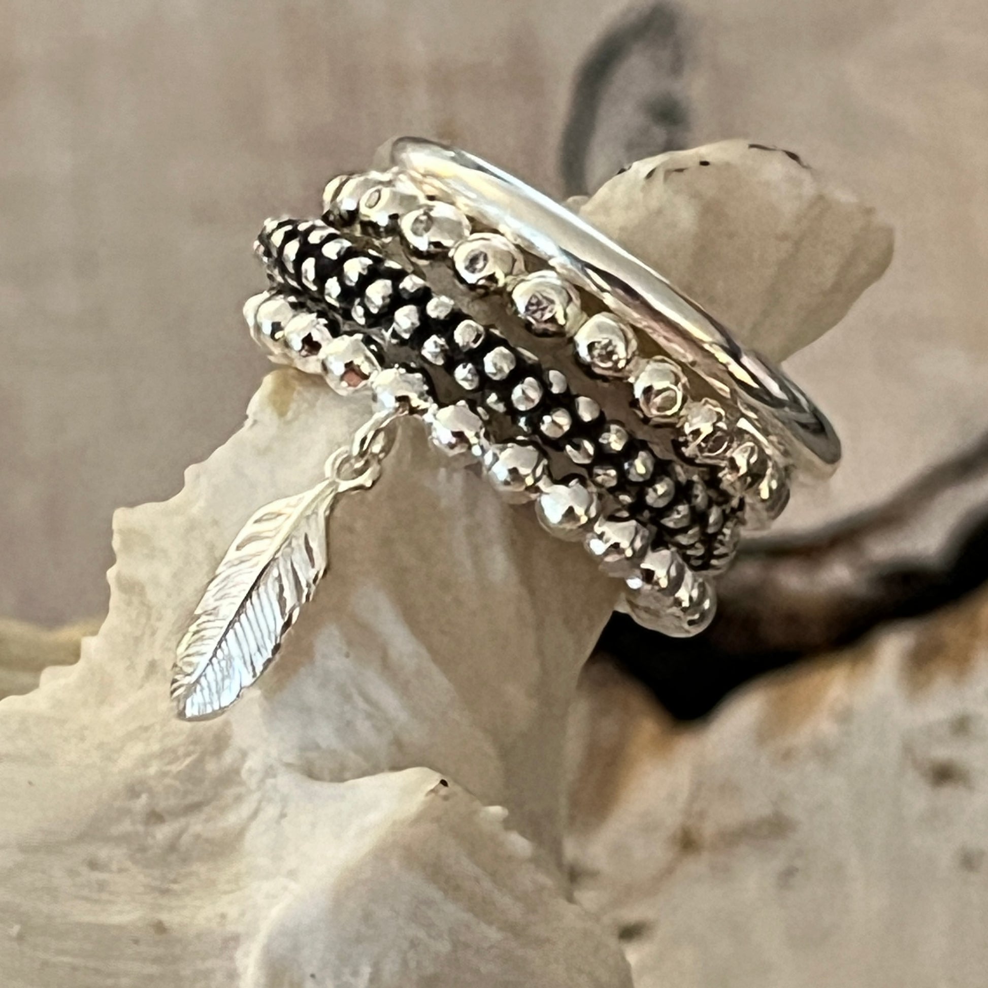 "Verbinde deinen Stil mit Ring Kombi! Dieses Set aus vier 925 Sterlingsilber Ringen 3mm kombiniert geschickt die Schönheit von geschwärzten Kugeln und glatt poliertem Silber. Die kleine Feder rundet das ganze ab. Ein einzigartiger Look, der für jeden Anlass geeignet ist. Nicht nur Ringe, sondern auch ein Statement!"
