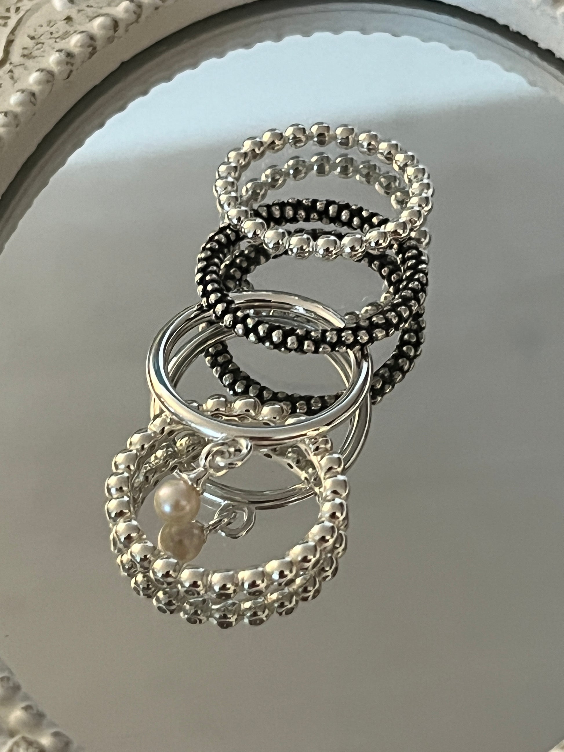 "Verbinde deinen Stil mit Ring Kombi! Dieses Set aus vier 925 Sterlingsilber Ringen 3mm kombiniert geschickt die Schönheit von geschwärzten Kugeln und glatt poliertem Silber. Die kleine Süsswasserperle rundet das ganze ab. Ein einzigartiger Look, der für jeden Anlass geeignet ist. Nicht nur Ringe, sondern auch ein Statement!"