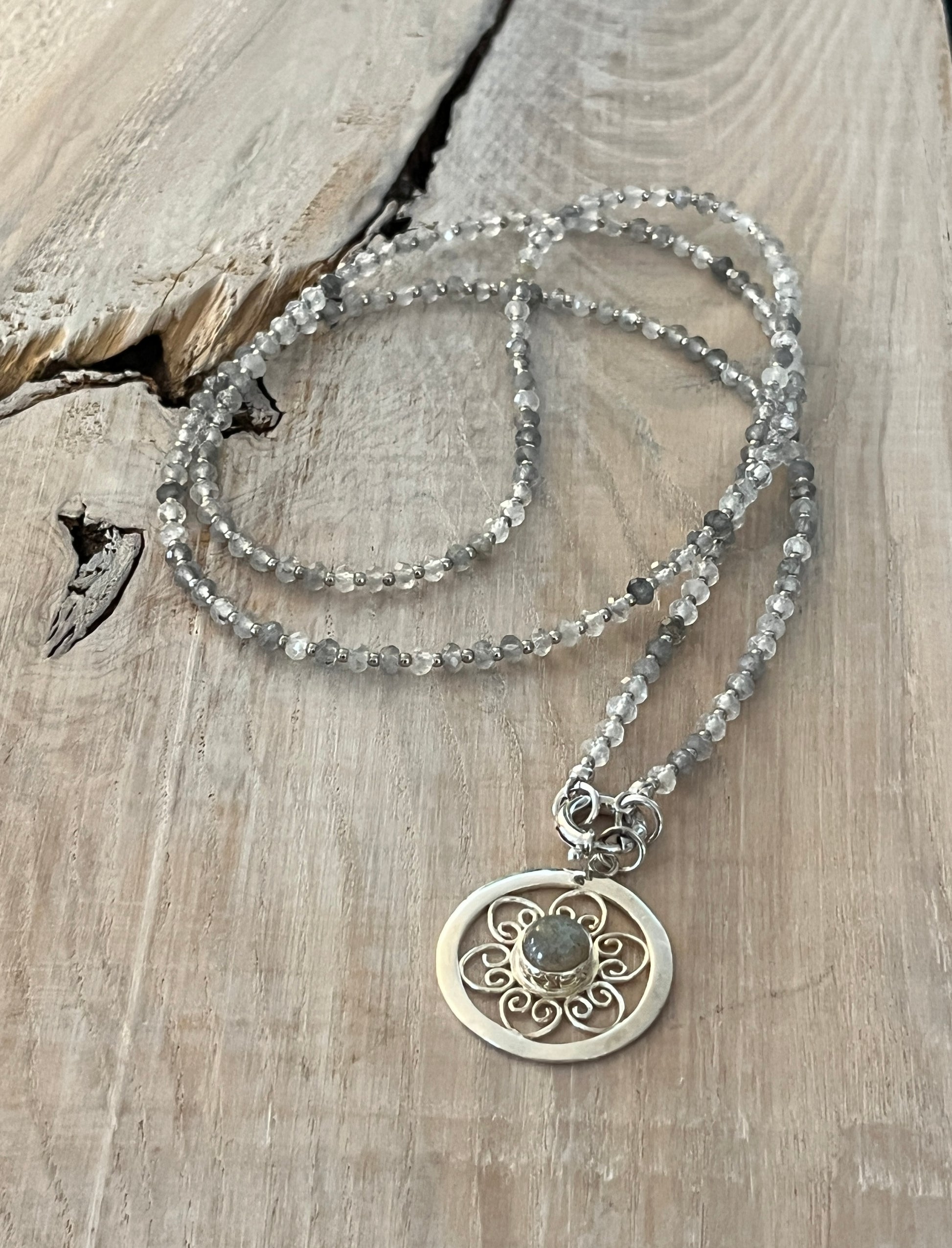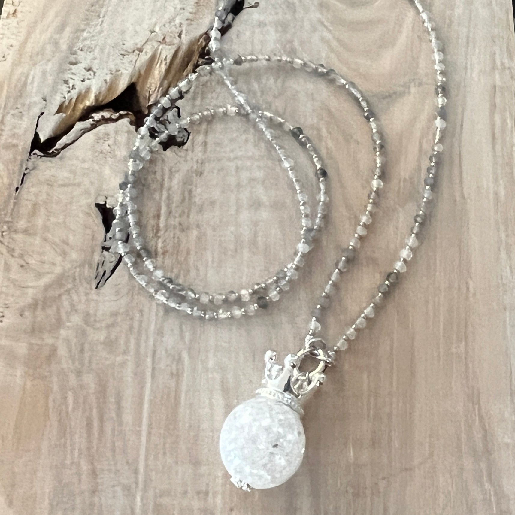 Die traumhaft schöne 4mm Silberquarzkette mit 925 Sterlingsilberteilchen rhodiniert und einem Ringverschluss ist ein wahres Schmuckstück. Mit einer Länge von 85cm ist sie vielseitig kombinierbar und verleiht jedem Outfit einen eleganten Touch. Tragen Sie sie mit oder ohne Anhänger - sie wird immer wunderschön aussehen. Die Kette mit Anhänger sind nur Beispielbilder. ES11